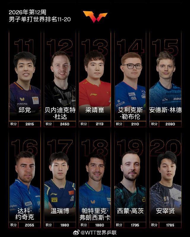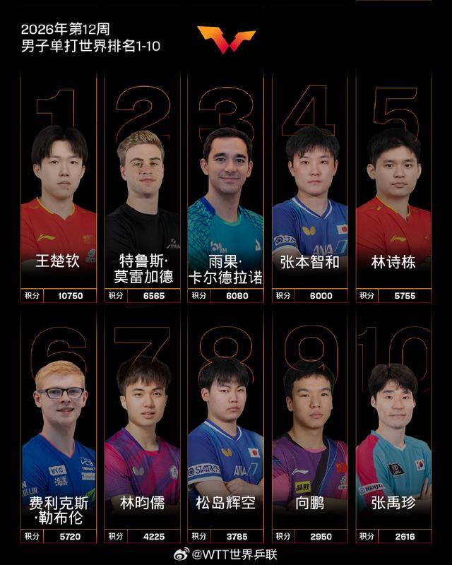 3月16日,国际乒联2026年第12周世界排名公布。
